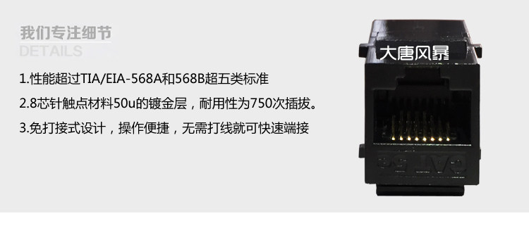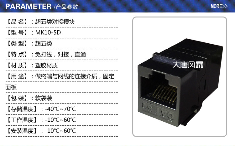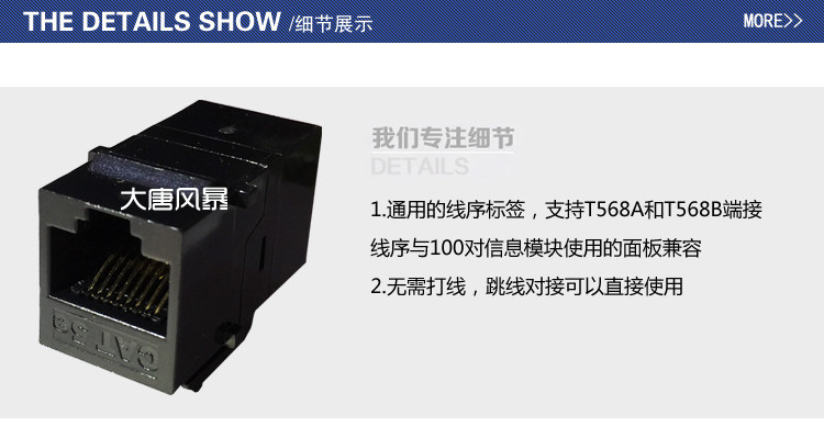 模块支持100MHz带宽,近端串扰(NEXT)≤-35dB@100MHz,回波损耗≤-20dB,满足PoE(15.4W)供电需求。通过ISO/IEC 11801-2 Class D级认证,工作温度范围-20℃~+75℃,插拔寿命≥1500次,抗震动与抗老化性能优异,适配高密度配线架、墙面面板及工业级机柜部署,确保办公室、学校、商场等场景长期稳定运行。灵活安装与多场景适配