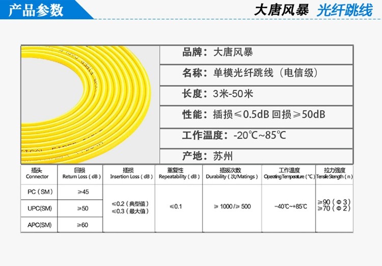 跳线内置高精度陶瓷插芯与UPC超物理端面研磨技术,SC接口防脱落快插设计,LC接口节省50%空间,插拔寿命≥1000次。外护套采用阻燃LSZH材质,抗拉强度≥120N,最小弯曲半径≤10倍线径,耐温范围-40℃~85℃,防尘防水等级达IP67,适应高温、潮湿、强振动及电磁干扰环境,广泛应用于电力通信、轨道交通及医疗影像系统,保障7×24小时不间断运行。全认证兼容与智能运维适配